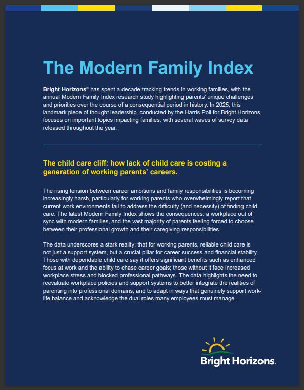 Bright Horizons has spent a decade tracking trends in working families, with the annual Modern Family Index research study highlighting parents' unique challenges and priorities over the course of a consequential period in history. In 2025, this landmark piece of thought leadership, conducted by the Harris Poll for Bright Horizons, focuses on important topics impacting families, with several waves of survey data released throughout the year.